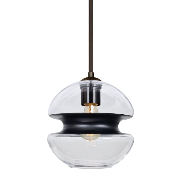 The transitional Hula 8 Pendant employs an impressive European glass shade with center radiused Black band dividing an upper and lower transparent glass, ideal for semi-concealing the light source while offering a peripheral shimmer via the clear glass. Produced in a theme inspired by the farmhouse trends of today, this pendant offers a look that will easily merge into virtually any design theme. The stem pendant fixture is equipped with an adjustable telescoping section, 4 connectable stem sections (3", 6", 12", and 18") and low Profile flat monopoint canopy. These stylish and functional luminaries are offered in a beautiful brushed Bronze finish.