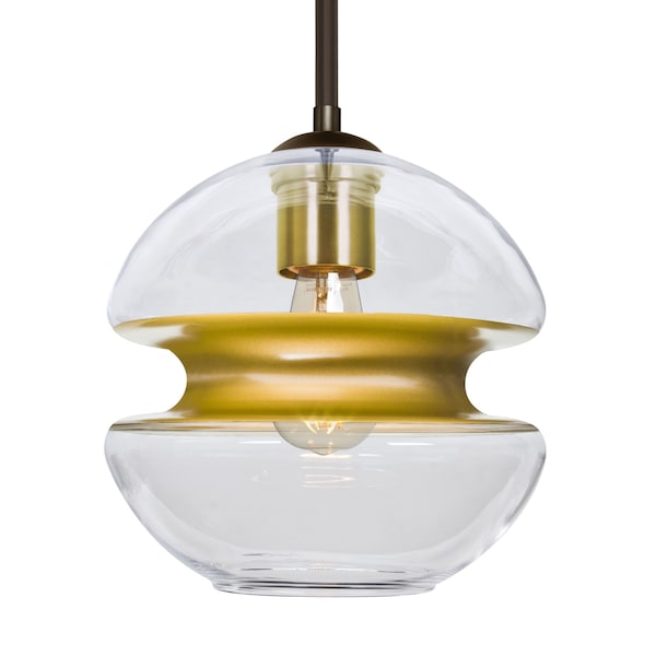The transitional Hula 8 Pendant employs an impressive European glass shade with center radiused Gold band dividing an upper and lower transparent glass, ideal for semi-concealing the light source while offering a peripheral shimmer via the clear glass. Produced in a theme inspired by the farmhouse trends of today, this pendant offers a look that will easily merge into virtually any design theme. The stem pendant fixture is equipped with an adjustable telescoping section, 4 connectable stem sections (3", 6", 12", and 18") and low Profile flat monopoint canopy. These stylish and functional luminaries are offered in a beautiful brushed Bronze finish.