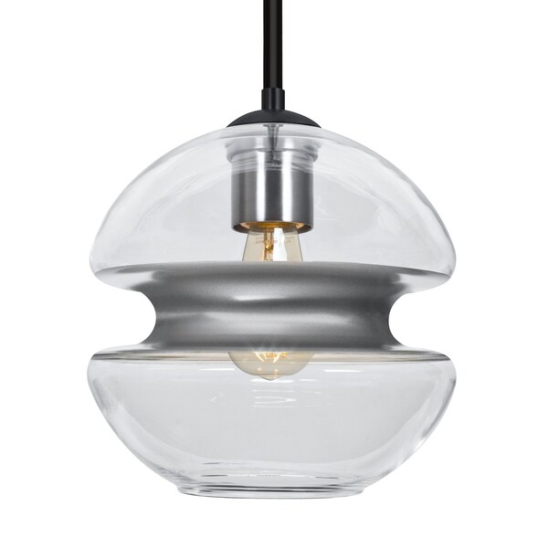 The transitional Hula 8 Pendant employs an impressive European glass shade with center radiused Silver band dividing an upper and lower transparent glass, ideal for semi-concealing the light source while offering a peripheral shimmer via the clear glass. Produced in a theme inspired by the farmhouse trends of today, this pendant offers a look that will easily merge into virtually any design theme. The stem pendant fixture is equipped with an adjustable telescoping section, 4 connectable stem sections (3", 6", 12", and 18") and low Profile flat monopoint canopy. These stylish and functional luminaries are offered in a beautiful Black finish.