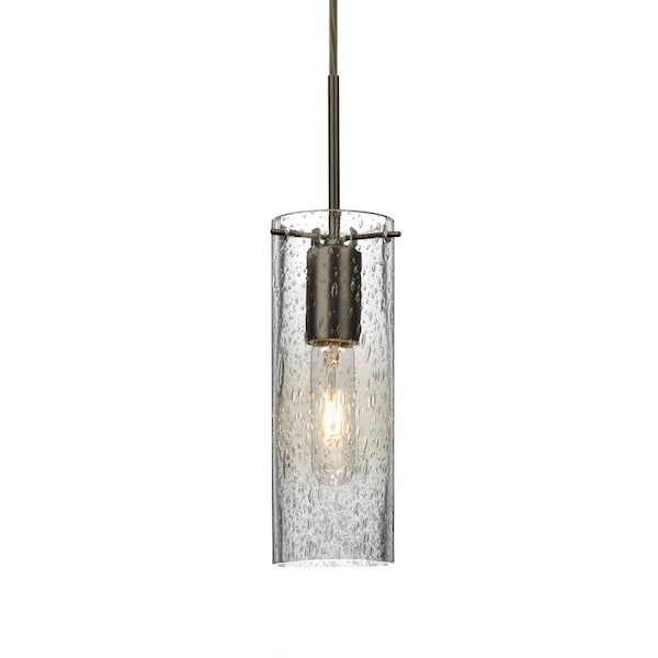 The Juni 10 Pendant is composed of a clear glass cylinder, with an interesting bubble pattern blown randomly throughout the glass. The pleasing play of light through the bubble accents make for a striking affect, along with the prominent display of the lamp filament behind the glass. The cord pendant fixture is equipped with a 10' SVT cord set and an low profile flat monopoint canopy. These stylish and functional luminaries are offered in a beautiful brushed Bronze finish.
