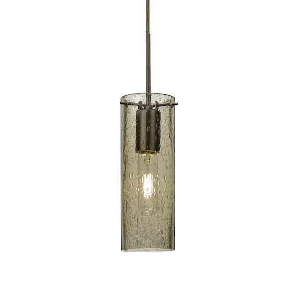 The Juni 10 Pendant is composed of a transparent Latte glass cylinder, with an interesting bubble pattern blown randomly throughout the glass. The pleasing play of light through the bubble accents make for a striking affect, along with the prominent display of the lamp filament behind the glass. The cord pendant fixture is equipped with a 10' SVT cord set and an low profile flat monopoint canopy. These stylish and functional luminaries are offered in a beautiful brushed Bronze finish.