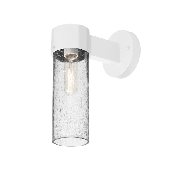 The Juni 10 sconce is composed of a White aluminum bracket and clear glass cylinder, with an interesting bubble pattern blown randomly throughout the glass. The pleasing play of light through the bubble accents make for a striking affect. The standard incandescent option offers a prominent display of the lamp filament behind the glass, while the LED option results in a splash of concealed LED downlight. These stylish and functional luminaries are offered in a beautiful White finish.