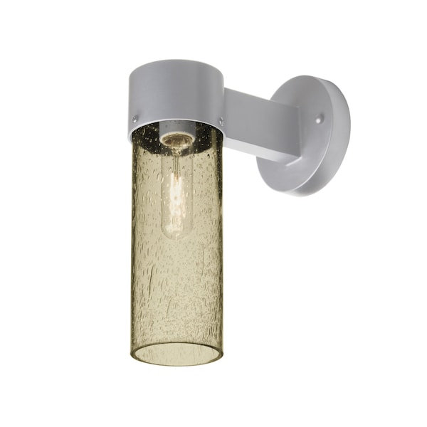 The Juni 10 sconce is composed of a Silver aluminum bracket and transparent Latte glass cylinder, with an interesting bubble pattern blown randomly throughout the glass. The pleasing play of light through the bubble accents make for a striking affect. The standard incandescent option offers a prominent display of the lamp filament behind the glass, while the LED option results in a splash of concealed LED downlight. These stylish and functional luminaries are offered in a beautiful Silver finish.