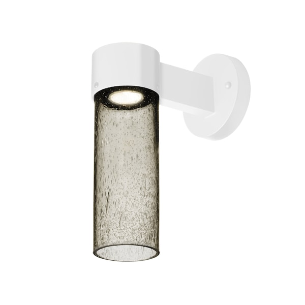 The Juni 10 sconce is composed of a White aluminum bracket and transparent Latte glass cylinder, with an interesting bubble pattern blown randomly throughout the glass. The pleasing play of light through the bubble accents make for a striking affect. The standard incandescent option offers a prominent display of the lamp filament behind the glass, while the LED option results in a splash of concealed LED downlight. These stylish and functional luminaries are offered in a beautiful White finish.