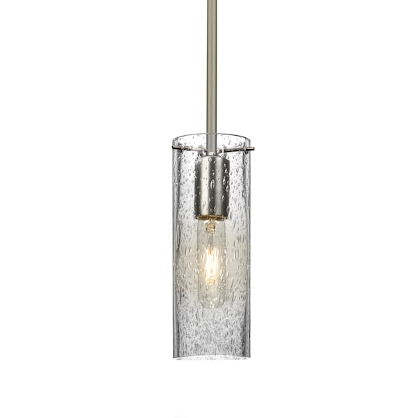 The Juni 10 Pendant is composed of a clear glass cylinder, with an interesting bubble pattern blown randomly throughout the glass. The pleasing play of light through the bubble accents make for a striking affect, along with the prominent display of the lamp filament behind the glass. The stem pendant fixture is equipped with an adjustable telescoping section, 4 connectable stem sections (3", 6", 12", and 18") and low Profile flat monopoint canopy. These stylish and functional luminaries are offered in a beautiful Satin Nickel finish.