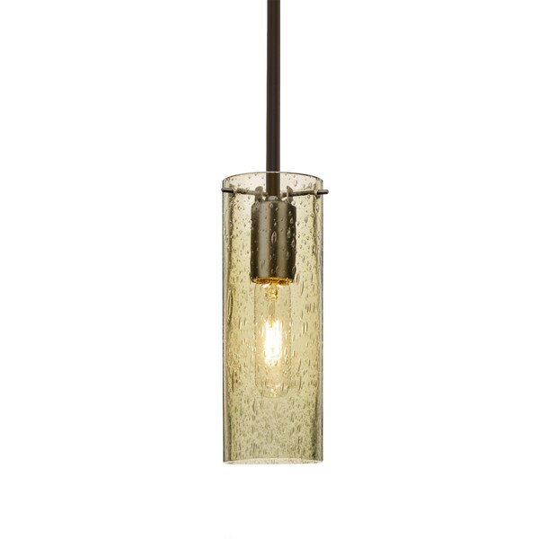 The Juni 10 Pendant is composed of a transparent Gold glass cylinder, with an interesting bubble pattern blown randomly throughout the glass. The pleasing play of light through the bubble accents make for a striking affect, along with the prominent display of the lamp filament behind the glass. The stem pendant fixture is equipped with an adjustable telescoping section, 4 connectable stem sections (3", 6", 12", and 18") and low Profile flat monopoint canopy. These stylish and functional luminaries are offered in a beautiful brushed Bronze finish.