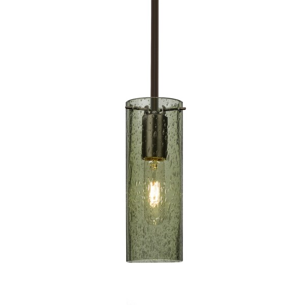 The Juni 10 Pendant is composed of a transparent Moss glass cylinder, with an interesting bubble pattern blown randomly throughout the glass. The pleasing play of light through the bubble accents make for a striking affect, along with the prominent display of the lamp filament behind the glass. The stem pendant fixture is equipped with an adjustable telescoping section, 4 connectable stem sections (3", 6", 12", and 18") and low Profile flat monopoint canopy. These stylish and functional luminaries are offered in a beautiful brushed Bronze finish.