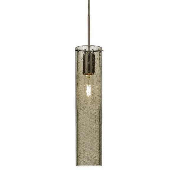 The Juni 16 Pendant is composed of a narrow transparent Latte glass cylinder, with an interesting bubble pattern blown randomly throughout the glass. The pleasing play of light through the bubble accents make for a striking affect, along with the prominent display of the lamp filament behind the glass. The cord pendant fixture is equipped with a 10' SVT cord set and an low profile flat monopoint canopy. These stylish and functional luminaries are offered in a beautiful brushed Bronze finish.