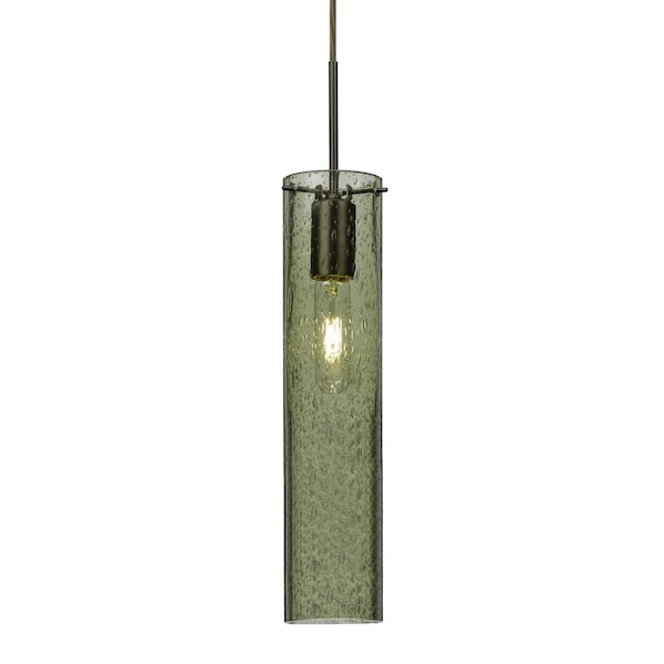 The Juni 16 Pendant is composed of a narrow transparent Moss glass cylinder, with an interesting bubble pattern blown randomly throughout the glass. The pleasing play of light through the bubble accents make for a striking affect, along with the prominent display of the lamp filament behind the glass. The cord pendant fixture is equipped with a 10' SVT cord set and an low profile flat monopoint canopy. These stylish and functional luminaries are offered in a beautiful brushed Bronze finish.