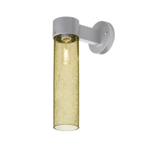 The Juni 16 sconce is composed of a Silver aluminum bracket and transparent Gold glass cylinder, with an interesting bubble pattern blown randomly throughout the glass. The pleasing play of light through the bubble accents make for a striking affect. The standard incandescent option offers a prominent display of the lamp filament behind the glass, while the LED option results in a splash of concealed LED downlight. These stylish and functional luminaries are offered in a beautiful Silver finish.