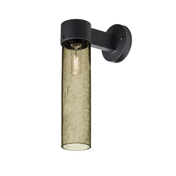The Juni 16 sconce is composed of a black aluminum bracket and transparent Latte glass cylinder, with an interesting bubble pattern blown randomly throughout the glass. The pleasing play of light through the bubble accents make for a striking affect. The standard incandescent option offers a prominent display of the lamp filament behind the glass, while the LED option results in a splash of concealed LED downlight. These stylish and functional luminaries are offered in a beautiful Black finish.