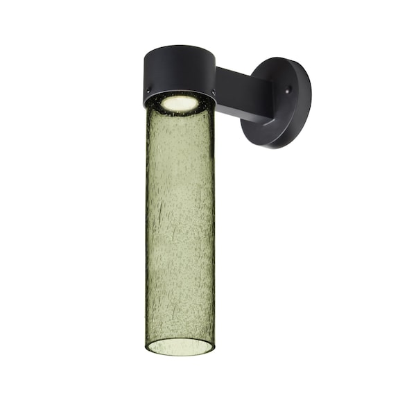 The Juni 16 sconce is composed of a black aluminum bracket and transparent Moss glass cylinder, with an interesting bubble pattern blown randomly throughout the glass. The pleasing play of light through the bubble accents make for a striking affect. The standard incandescent option offers a prominent display of the lamp filament behind the glass, while the LED option results in a splash of concealed LED downlight. These stylish and functional luminaries are offered in a beautiful Black finish.