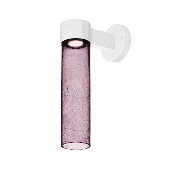 The Juni 16 sconce is composed of a White aluminum bracket and transparent Plum glass cylinder, with an interesting bubble pattern blown randomly throughout the glass. The pleasing play of light through the bubble accents make for a striking affect. The standard incandescent option offers a prominent display of the lamp filament behind the glass, while the LED option results in a splash of concealed LED downlight. These stylish and functional luminaries are offered in a beautiful White finish.