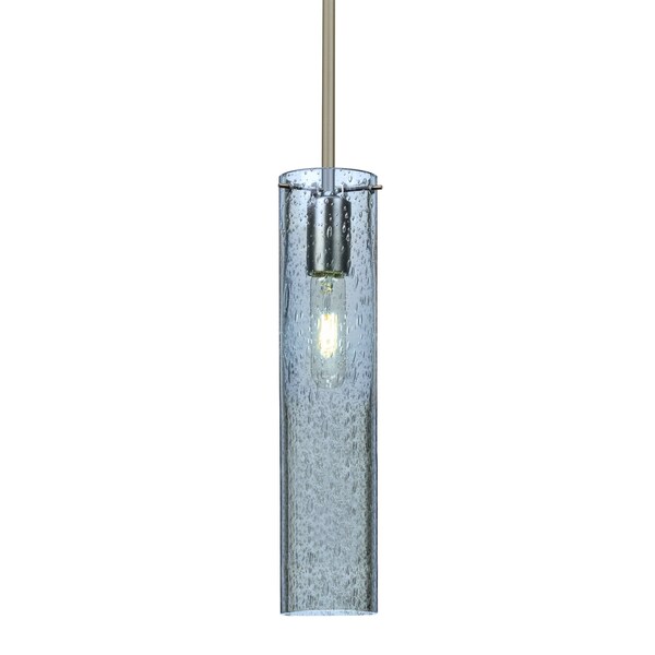 The Juni 16 Pendant is composed of a narrow transparent Blue glass cylinder, with an interesting bubble pattern blown randomly throughout the glass. The pleasing play of light through the bubble accents make for a striking affect, along with the prominent display of the lamp filament behind the glass. The stem pendant fixture is equipped with an adjustable telescoping section, 4 connectable stem sections (3", 6", 12", and 18") and low Profile flat monopoint canopy. These stylish and functional luminaries are offered in a beautiful Satin Nickel finish.