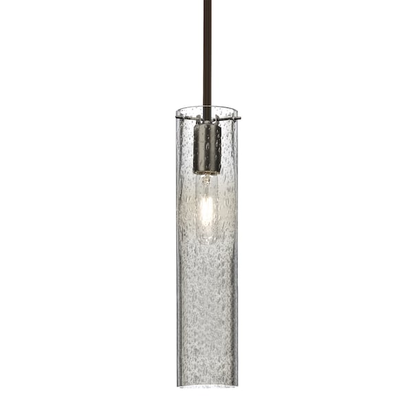 The Juni 16 Pendant is composed of a narrow clear glass cylinder, with an interesting bubble pattern blown randomly throughout the glass. The pleasing play of light through the bubble accents make for a striking affect, along with the prominent display of the lamp filament behind the glass. The stem pendant fixture is equipped with an adjustable telescoping section, 4 connectable stem sections (3", 6", 12", and 18") and low Profile flat monopoint canopy. These stylish and functional luminaries are offered in a beautiful brushed Bronze finish.