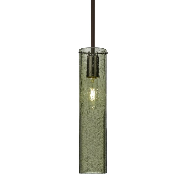 The Juni 16 Pendant is composed of a narrow transparent Moss glass cylinder, with an interesting bubble pattern blown randomly throughout the glass. The pleasing play of light through the bubble accents make for a striking affect, along with the prominent display of the lamp filament behind the glass. The stem pendant fixture is equipped with an adjustable telescoping section, 4 connectable stem sections (3", 6", 12", and 18") and low Profile flat monopoint canopy. These stylish and functional luminaries are offered in a beautiful brushed Bronze finish.