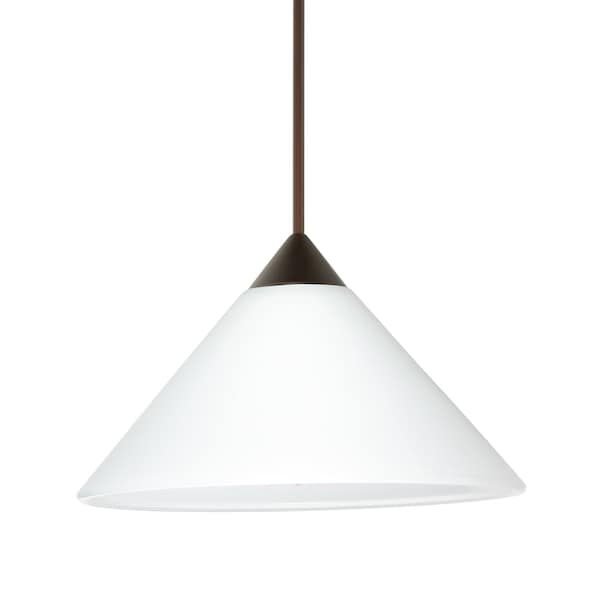 The Kona pendant features a wide cone-shaped glass, that demonstrates contemporary sensibilities. Our White glass is a soft white cased glass that can suit any classic or modern decor. White has a very tranquil glow that is pleasing in appearance. The smooth satin finish on the clear outer layer is a result of an extensive etching process. This blown glass is handcrafted by a skilled artisan, utilizing century-old techniques passed down from generation to generation. The 12V cord pendant fixture is equipped with a 10' braided coaxial cord with Teflon jacket and a low profile flat monopoint canopy. These stylish and functional luminaries are offered in a beautiful brushed Bronze finish.
