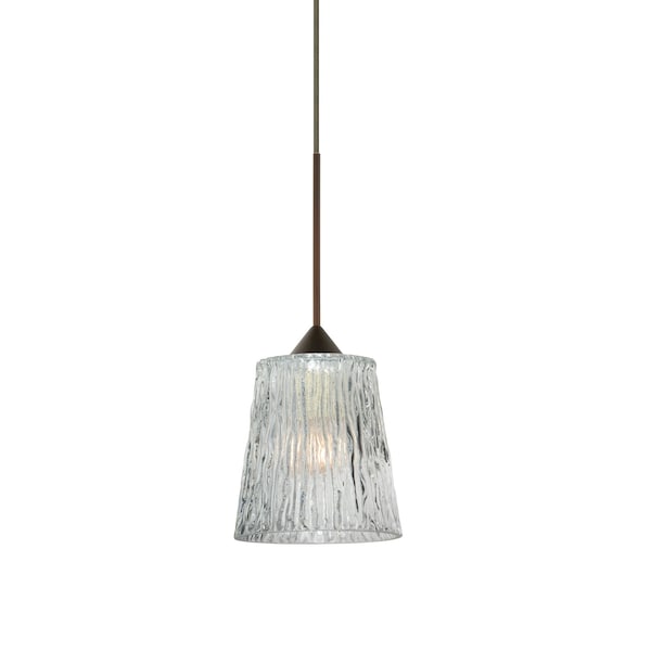 Nico 4 features a tapered drum shape that fits beautifully in transitional spaces. Our Clear Stone glass is a clear blown glass with an outer texture of coarse sandstone. Inspired by the elements of nature, the appearance of the surface resembles the beautiful cut patterning melting ice over a rock formation. This blown glass is handcrafted by a skilled artisan, utilizing century old techniques that have been passed down from generation to generation. Each piece of this décor has its own artistic nature that can be individually appreciated. The 12V cord pendant fixture is equipped with a 10' braided coaxial cord with Teflon jacket and a low profile flat monopoint canopy. These stylish and functional luminaries are offered in a beautiful brushed Bronze finish.
