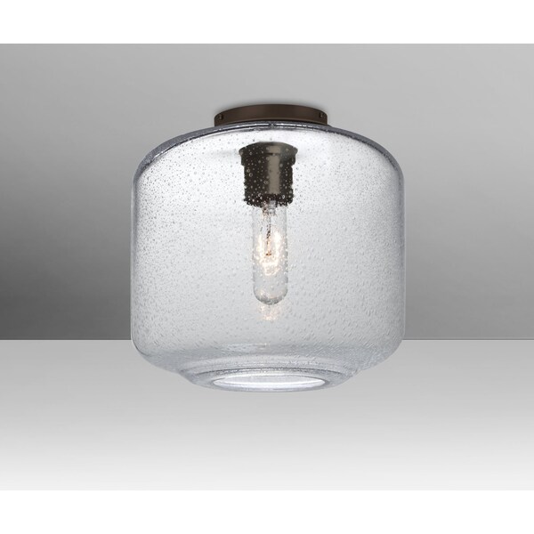 The Niles Clear Ceiling is composed of a broad clear glass cylinder, with an interesting bubble pattern blown randomly throughout the glass and exposed light source. The pleasing play of light through the bubble accents make for a striking affect, along with the popular theme of this transitionally designed Ceiling. The semi-flush fixture is equipped with a low profile flat canopy, with machined and plated glassholder hardware. These stylish and functional luminaries are offered in a beautiful brushed Bronze finish.