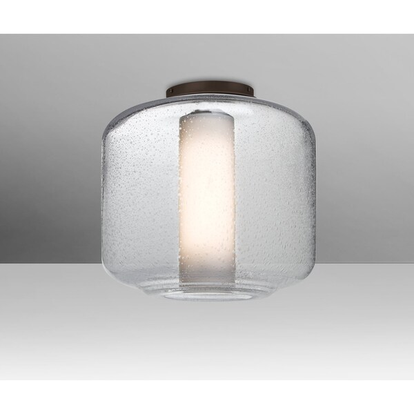 The Niles Clear/Opal Ceiling is composed of a broad clear glass cylinder, with an interesting bubble pattern blown randomly throughout the glass and an inner opal cylinder for concealing the light source. The pleasing play of light through the bubble accents make for a striking affect, along with the popular theme of this transitionally designed Ceiling. The semi-flush fixture is equipped with a low profile flat canopy, with machined and plated glassholder hardware. These stylish and functional luminaries are offered in a beautiful brushed Bronze finish.