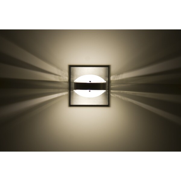 The Optos wall sconce uses two separate optical-effect lenses to produce interesting displays of up/down light. The aluminum body allows for 359 degree rotation and holds the lenses with clips. Our Frost Lens is a clear molded borosilicate glass with frosted finish, with a parabolic shape designed to carefully diffuse light from the light source. The result is an edgy display that exudes an energetic mood. When lit this gives off a light that is functional and vibrant. This handcrafted glass uses a process where every glass is consistently produced using a mold, keeping variations to a minimum. These stylish and functional luminaries are offered in a beautiful Brushed Aluminum finish.