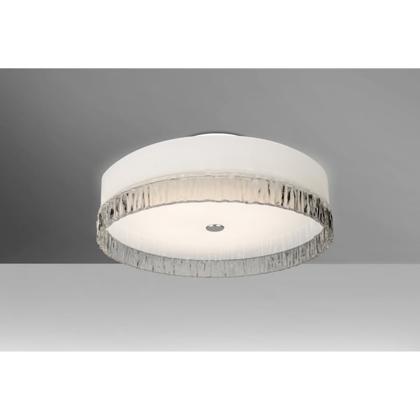 The low-profile Paco 19 flush mount uses a multi-layered glass, with two cylindrical sections fused together onto a flat white glass. The top portion is opal glossy glass with a contemporary polished finish, and the bottom is a transparent smoke blown glass with an outer texture of coarse sandstone resembling the beautiful cut patterning of a rock formation. The tranquil glow has a low key harmonious display that exudes a warm mood. When lit the glass is vitalizing as well as stylish.