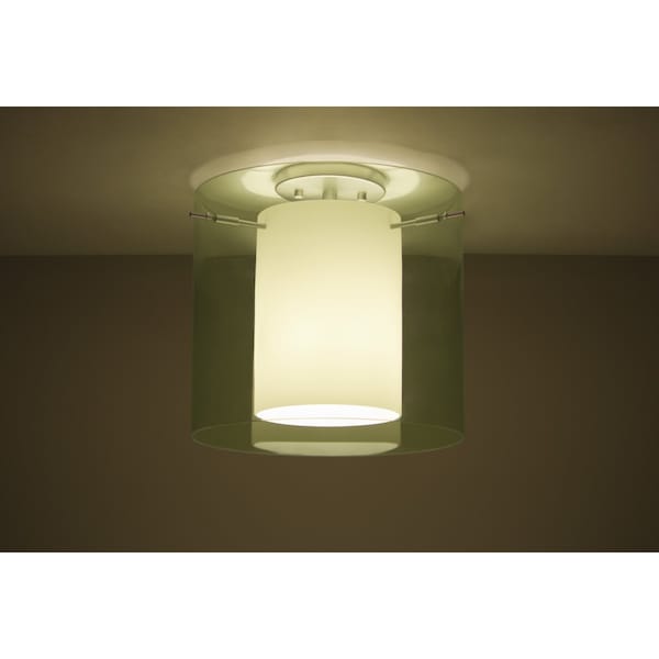 Pahu is a distinctive double-glass semi-flush mount ceiling fixture with an inner opal cylinder centered within a transparent outer glass Our Trans-Olive colored blown glass complements the soft white Opal cased glass, which can suit any classic or modern decor. Opal has a very tranquil glow that is pleasing in appearance, as the Trans-Olive glass sparkles with the accents from that glow. The smooth satin finish on the opal’s outer layer is a result of an extensive etching process. This blown glass combination is handcrafted by a skilled artisan, utilizing century-old techniques passed down from generation to generation. The semi-flush fixture is equipped with a 3-socket cluster on a low profile flat canopy, with machined and plated glass holder hardware These stylish and functional luminaries are offered in a beautiful Satin Nickel finish.