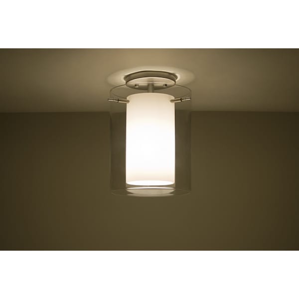 Pahu is a distinctive double-glass semi-flush mount ceiling fixture with an inner opal cylinder centered within a transparent outer glass The clear blown glass complements the soft white Opal cased glass, which can suit any classic or modern decor. Opal has a very tranquil glow that is pleasing in appearance, as the clear glass sparkles with the accents from that glow. The smooth satin finish on the opal’s outer layer is a result of an extensive etching process. This blown glass combination is handcrafted by a skilled artisan, utilizing century-old techniques passed down from generation to generation. The semi-flush fixture is equipped with a 3-socket cluster on a low profile flat canopy, with machined and plated glass holder hardware These stylish and functional luminaries are offered in a beautiful Satin Nickel finish.