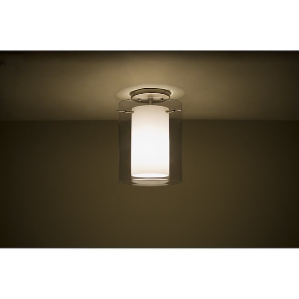 Pahu is a distinctive double-glass pendant, with an inner opal cylinder centered within a transparent outer glass Our Trans-Smoke colored blown glass complements the soft white Opal cased glass, which can suit any classic or modern decor. Opal has a very tranquil glow that is pleasing in appearance, as the Trans-Smoke glass sparkles with the accents from that glow. The smooth satin finish on the opal’s outer layer is a result of an extensive etching process. This blown glass combination is handcrafted by a skilled artisan, utilizing century-old techniques passed down from generation to generation. The semi-flush fixture is equipped with a 3-socket cluster on a low profile flat canopy, with machined and plated glass holder hardware These stylish and functional luminaries are offered in a beautiful Satin Nickel finish.