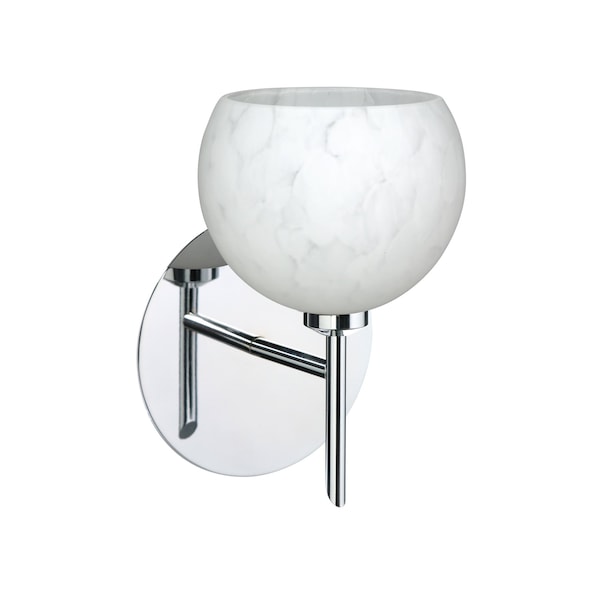 The Palla 5 features a diminutive orb-shaped glass, that complements any aesthetic. Our Carrera glass is a classic yet modern décor that gives off a soft white light. Clear molten glass is rolled in alabaster powder like frit, and then blown into shape with a semi-clear frosted white inner finish. This décor is created by rolling molten glass in small bits of white called frit. The smooth satin finish on the clear outer layer is a result of an extensive etching process. This blown glass is handcrafted by a skilled artisan, utilizing century-old techniques passed down from generation to generation. Each piece of this décor has its own artistic nature that can be individually appreciated. The mini sconce is equipped with a decorative lamp holder mounted to either a low profile round or square canopy. These stylish and functional luminaries are offered in a beautiful Chrome finish.