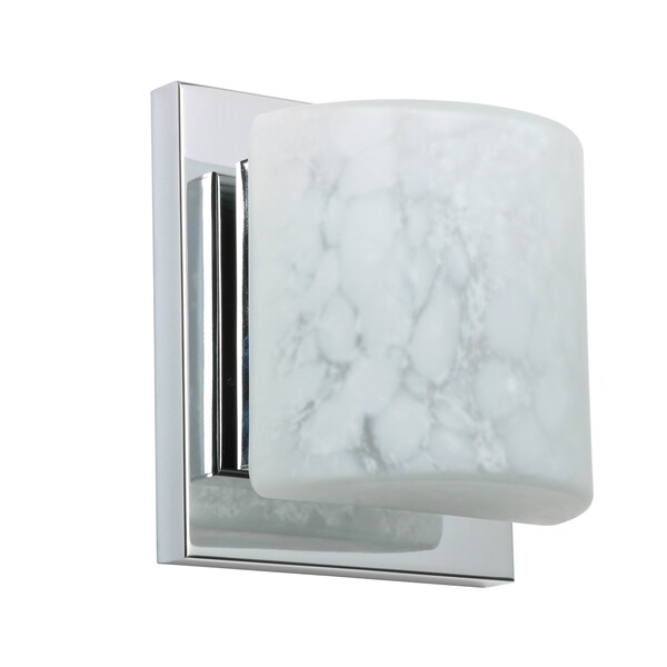 Contemporary Paolo enclosed half-cylinder design features handcrafted glass. This modern wall light offers flexible design potential for a variety of bath/vanity decorating schemes. Mount horizontally or vertically. ADA-Compliant. Our Carrera glass is a classic yet modern décor that gives off a soft white light. Clear molten glass is rolled in alabaster powder like frit, and then blown into shape with a semi-clear frosted white inner finish. This décor is created by rolling molten glass in small bits of white called frit. The smooth satin finish on the clear outer layer is a result of an extensive etching process. This blown glass is handcrafted by a skilled artisan, utilizing century-old techniques passed down from generation to generation. Each piece of this décor has its own artistic nature that can be individually appreciated. The sconce fixture is equipped with plated steel square lamp holders mounted to linear rectangular tubing, and a low profile square canopy cover. These stylish and functional luminaries are offered in a beautiful Chrome finish.