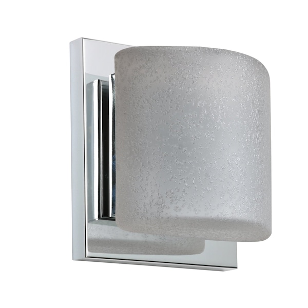 Contemporary Paolo enclosed half-cylinder design features handcrafted glass. This modern wall light offers flexible design potential for a variety of bath/vanity decorating schemes. Mount horizontally or vertically. ADA-Compliant. The Stucco decor starts with a clear blown glass with a subtle matte frost, then we apply a uniform patterning of textured clear glazing. The result is a sophisticated adaptation of the luxurious and tactile finish used within the elegant Venetian plaster finish. When illuminated, the glazed accents create a striking diffuse glow that calls attention to the timeless texture. The sconce fixture is equipped with plated steel square lamp holders mounted to linear rectangular tubing, and a low profile square canopy cover. These stylish and functional luminaries are offered in a beautiful Chrome finish.