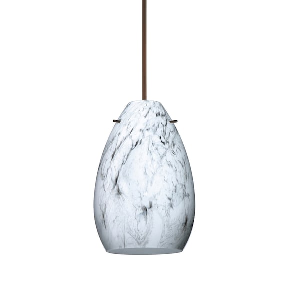 The Pera 6 is a curvy bell-bottomed shape, that fits nicely into any contemporary design. Our Marble Grigio glass is a bright white cased glass, with inner opal and a glossy finish. The white color is accented by flowing marbleized black lines, and nestled between the inner opal and outer clear layers. When lit the glass is vitalizing as well as stylish, that adds appeal to any environment. This blown glass is handcrafted by a skilled artisan, utilizing century-old techniques passed down from generation to generation. Each piece of this décor has its own artistic nature that can be individually appreciated. The 12V cord pendant fixture is equipped with a 10' braided coaxial cord with Teflon jacket and a low profile flat monopoint canopy. These stylish and functional luminaries are offered in a beautiful brushed Bronze finish.