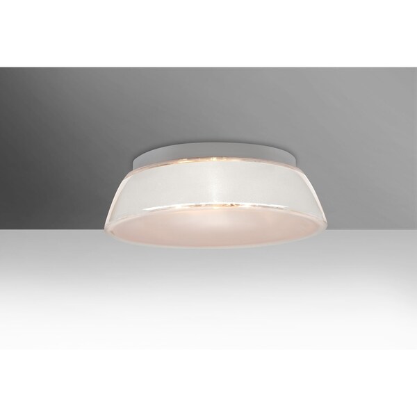 Our Pica White flush mount begins with a clear blown glass, with glossy outer finish and frosted bottom. We then, using a handcrafting technique, carefully apply a band of actual fine-grained sand to the inner surface of the glass, where white color is fully saturated into the coating for a bold statement. A final clear protective coating is applied to seal and preserve the accent material. The result is a beautifully textured work of art, comfortable with the irony of sand being applied to a glass that ordinates from sand. When illuminated, the colors shimmers through the noticeable refractions created by every granule, as the sand patterning is obvious and pleasing.