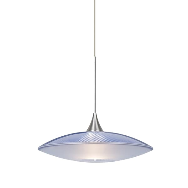 The Spazio Blue/Frost pendant features two softly radiused glasses, fused together to create a refined contemporary look. Our transparent blue prismatic top glass is internally stippled with a contemporary polished outer finish, while the bottom glass has been softly frosted on the outer surface. The result is tranquil bottom glow with a low key harmonious display that exudes a warm mood, contrasted by a dazzling optical effect created by the highly refracting top glass. The 12V cord pendant fixture is equipped with a 10' braided coaxial cord with teflon jacket and a low profile flat monopoint canopy. These stylish and functional luminaries are offered in a beautiful Satin Nickel finish.