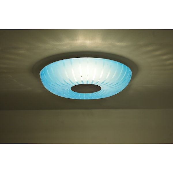 The Spira Flush mount is a modern flush mount, composed of an interestingly toroid-shaped blown coral blue glass shade with radially patterned frosted stripes. The indirect LED light source's glow beautifully complements the glass design by highlighting the frosted etchings from the transparent space. These stylish and functional luminaries are offered in a beautiful Black finish.