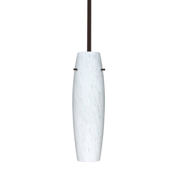 The Suzi is a slender yet shapely handcrafted glass with a open top and bottom. Our Carrera glass is a classic yet modern décor that gives off a soft white light. Clear molten glass is rolled in alabaster powder like frit, and then blown into shape with a semi-clear frosted white inner finish. This décor is created by rolling molten glass in small bits of white called frit. The smooth satin finish on the clear outer layer is a result of an extensive etching process. This blown glass is handcrafted by a skilled artisan, utilizing century-old techniques passed down from generation to generation. Each piece of this décor has its own artistic nature that can be individually appreciated. The stem pendant fixture is equipped with an adjustable telescoping section, 4 connectable stem sections (3", 6", 12", and 18") and low Profile flat monopoint canopy. These stylish and functional luminaries are offered in a beautiful brushed Bronze finish.
