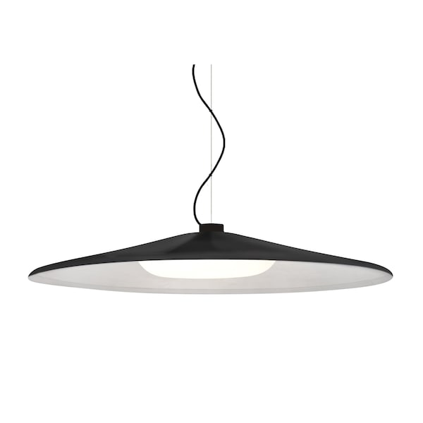 Our Swan employs a contemporary large-scale spun aluminum shade along with a blown glass toroidal diffuser, for a seductive inner glow combined with effective downlighting. The upper portion of the shade is painted in various color options, resulting in a design ideal for a diverse group of architectural spaces. The cable pendant fixture is equipped with a 10' silver aircraft cable and AWM cordset, and a flat monopoint canopy. These stylish and functional luminaries are offered in a beautiful Black finish.