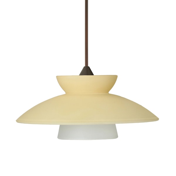 Trilo 7 is comprised of three complementary glass segments, resulting in a playful glass display. Our Champagne glass is a light yellow pressed glass, with a white inner layer. When lit this gives off a light that is functional and soothing. Champagne is a pleasing neutral color that suits almost any décor. The smooth satin finish on the clear outer layer is a result of an extensive etching process. This handcrafted glass uses a process where every glass is consistently produced using a press mold, keeping variations to a minimum. The 12V cord pendant fixture is equipped with a 10' braided coaxial cord with Teflon jacket and a low profile flat monopoint canopy. These stylish and functional luminaries are offered in a beautiful brushed Bronze finish.