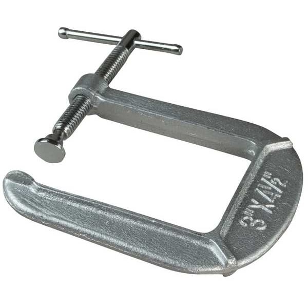 C-Clamp, Jaw Pad Type Flat, Includes Swivel Pad Yes, Jaw Opening - Maximum 3 in, Jaw Opening - Minimum 0 in, Throat Depth 4 1/2 in, Clamping Force 900 lb, Body Material Drop Forged Steel, Body Color Gray, Spindle Finish Galvanized, Spindle Material Steel, Handle Type Sliding T, High Visibility No, Number of Anvils 1, Number of Spindles 1, Release Mechanism Standard Thread, Body Finish Galvanized, Throat Shape Standard