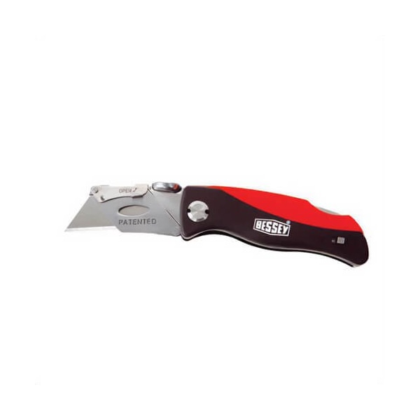 Bessey folding utility knife 2-3/8 in blade length, lockable blade, steel blade, blades included: 5, yes replaceable blade, ergonomic handle, 4 in handle, plastic handle, 6-1/4 in OAL, 7/8 in overall width, 4 in overall depth.