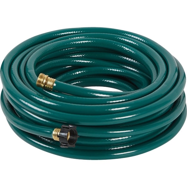 Light-duty garden hose. Features 3-ply construction and all-season flexibility. Includes brass male coupling and plastic female coupling knitted nylon reinforcement vinyl cover and green color. 250 PSI (pounds per square inch). Not safe for drinking water.