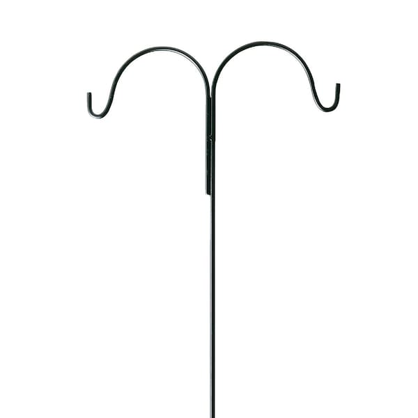 Double rod hanger installs in ground easily by using the H-hook on the bottom of the rod. Constructed of 1/2 In. wrought iron rod. For use in hanging flower baskets bird feeders bug lights and various hanging yard art. Black hammertone finish. Designed for 12 In. basket 12 Lb. weight capacity for single side or 20 Lb. for 2 sides.