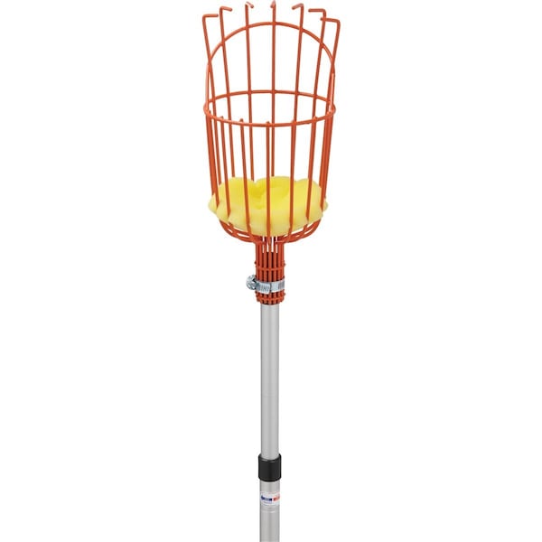 Long handle fruit picker for harvesting fresh fruit. Strong metal tongs to grasp fruit and cushioned metal basket to hold fruit. Aluminum telescopic handle extends up to 8.