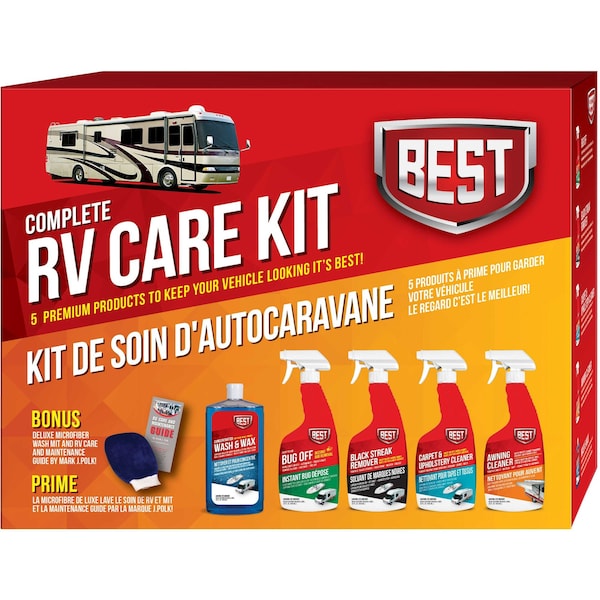 Complete RV Maintenance in one box! Each kit contains one 1 32 oz. bottle of each of our five most popular products, plus a bonus Microfiber Wash Mitt and our exclusive RV Care and Maintenance Guide written by Mark J. Polk - owner of RV Education 101! Includes one each: Wash & Wax, Bug Off, Black Streak Remover, Carpet Upholstery Cleaner, Awning Cleaner. Perfect for yourself or as a gift for the new RV owner in your life!