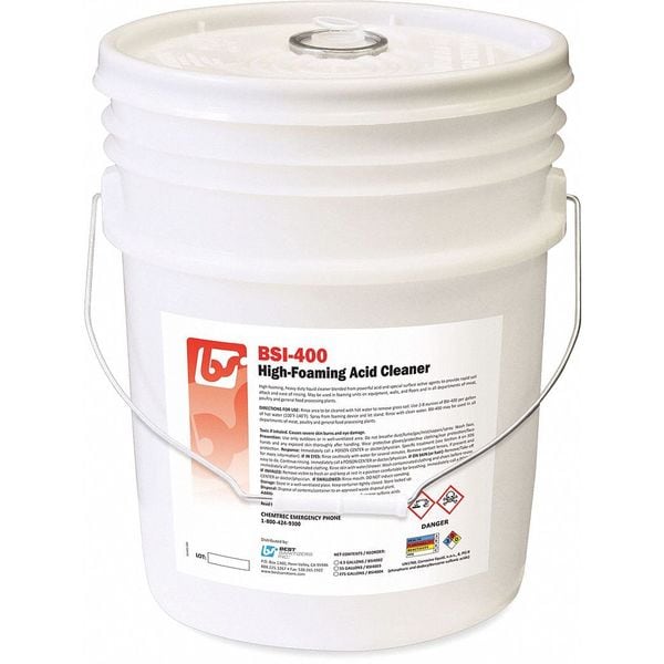 Acidic Cleaner, High-Foaming Cleaner, Surfaces for Use On Hard Nonporous Surfaces, Bucket, 5 gal, Fragrance Unscented, Ready to Use/Concentrated Concentrated, Recommended Dilution 2 to 8 ounces per gallon, Primary Chemical None, Foam, Standards Letter of Guarantee, OSHA, Color White, Butyl Free Yes, VOC Content 4 Percent, Flash Point None, NSF Rating A3, pH Level 1, pH Value Acidic, Product Series BSI Industrial Cleaner, Rinse Required Yes, Nonflammable Yes, Net Weight 52.2 lb.