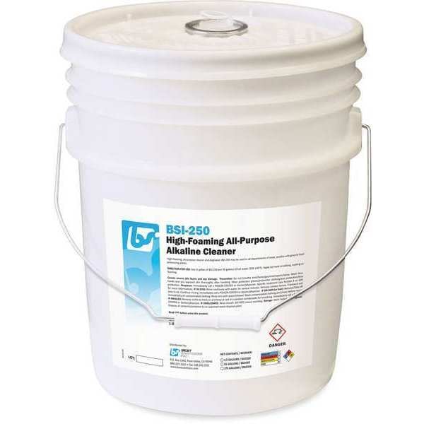 Alkaline Cleaner and Degreaser, High-Foaming Cleaner, Surfaces for Use On Hard Nonporous Surfaces, Bucket, 5 gal, Fragrance Unscented, Ready to Use/Concentrated Concentrated, Recommended Dilution 1/2 gallon per 50 gallons, Primary Chemical None, Foam, Standards Letter of Guarantee, OSHA, Color White, Butyl Free No, VOC Content 0 Percent, Flash Point None, NSF Rating Not Rated, pH Level 13, pH Value Alkaline, Product Series BSI Industrial Cleaner, Rinse Required Yes, Nonflammable Yes