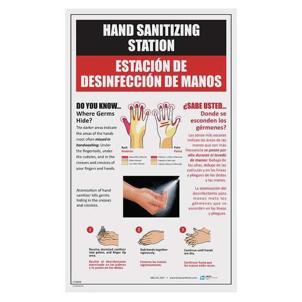 Bilingual Hand Sanitizing Poster, Color Multicolored, Product Type Hand Sanitizer Sign, Material Paper, Plastic, Compatible with Manufacturer Model Number MD10006, MD10012, MD10105, Ligature Resistant No, Standards Not Applicable, Overall Height 14 in, Overall Width 1/4 in, Compatible with Grainger Part Number 36P166, 36P167, 36P170
