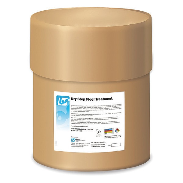 Dry Step Floor Treatment, Cleaner Form Granules, Container Size 100 lb, Container Type Drum, For Floor Type Asphalt, Brick, Ceramic, Concrete, Granite, Laminate, Linoleum, Marble, Porcelain, Rubber, Slate, Terrazzo, Travertine, Vinyl, Wood, pH Level 10, pH Value Alkaline, Product Series Dry Step, Properties Low Foam, Nonflammable, Ready to Use, Recommended Dilution Ready to Use, Standards DSL, NDSL, TSCA, Color White, Flash Point Not Flammable, Fragrance Unscented