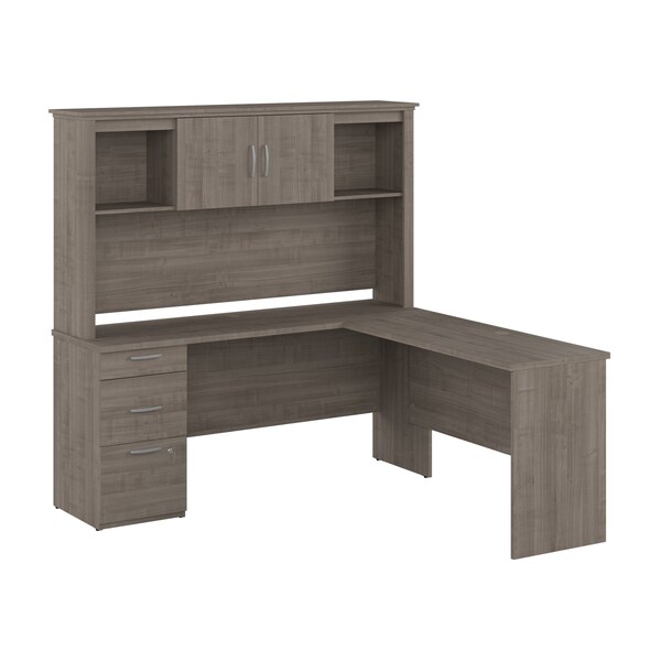 Create the perfect work area and tackle your next project with the Bestar Logan 65W L Shaped Desk with Hutch. This ample workstation will serve for many years to come and provide a comfortable desk for you to work on and store your office accessories in. Enjoy work shifts and complete daily tasks on a durable melamine surface that resists scratches, stains, and wear. The sturdy desktop supports up to 200 pounds of office equipment. Wall attachment hardware is included for family-friendly safety and security in your home office. A lockable file drawer glides on smooth full-extension ball-bearing slides for an easy reach to legal, letter, and A4-size paperwork. The computer desk features one closed storage area and one box drawer to accommodate small office supplies, while two wire management grommets on the desktop allow for easy organization and concealment of cables from electronics. The pedestal and Return can be installed on either side of the desk for a left- or right-handed configuration. The practical Hutch offers two open storage compartments for binders, decor items, or plants and one closed storage area for spare office supplies. See the full Logan Collection to create the perfect office space with a file cabinet, bookcase, and more .